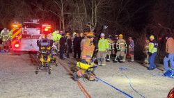A major rescue operation resulted after a police chase ended in Monessen. Offcials say the police pursuit began after a vehicle was reported stolen out of Charleroi around 4:30 p.m.Sunday. A foot pursuit later began, with one person being detained, and two others fleeing on foot over an embankment in Monessen, the supervisor says. Police detained the suspects, and a rescue operation ensued to bring them up the hillside in the area of Dennis Avenue near Route 906. urrysville Medic One shared photos of the operation, saying its rope rescue team extracted three police officers and two suspects from the 600-foot hillside. In total, 12 people needed to be brought up the hillside, including the two suspects, police officers and firefighters. Everyone had been brought up by 9 p.m. At least one of the suspects was taken by ambulance to a local hospital. One police officer reportedly self-transported to the hospital for an eye injury.