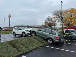 ROSTRAVER, Pa. — (WPXI) – One person was taken to a hospital after two vehicles crashed outside an Eat’N Park in Rostraver. The Rostraver Central Fire Department said the crash happened in the parking lot of the restaurant on Broad Avenue. Two vehicles were involved in the crash and both sustained damage after hitting head-on. One of the vehicles appeared to have climbed up a small hill. Firefighters say one person was treated by Allegheny Health Network medics on the scene and was later taken to a hospital. Rostraver Township Police are investigating the crash. (PHOTO; Rostraver Central Fire Department)