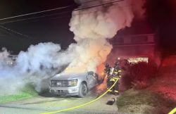 PLEASANT HILLS, Pa. — (WPXI) – A hybrid battery ignited a truck fire in Allegheny County. Pleasant Hills Volunteer Fire Company crews responded to a reported fire in the bed of a pick-up truck on Oakcrest Lane Sunday around 2:30 a.m. When firefighters arrived, they found the truck “well involved” and began to put out the flames. Fire officials say they used a ground monitor to flow water on the battery for nearly an hour to cool it off and extinguish the fire. Although the truck was destroyed, first responders tell Channel 11 that no one was hurt and a nearby home was not damaged. (PHOTO: Pleasant Hills Volunteer Fire Department)