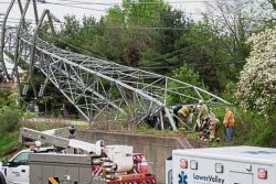 HARMAR TOWNSHIP, Pa. — A man had to be airlifted to the hospital after he smashed his vehicle into a 90-foot power transmission tower, trapping him inside. The accident happened Saturday afternoon on Russellton Road in Harmar Township, according to reports. The crash caused the Duquesne Light tower to fall onto a set of power lines owned by West Penn Power, knocking out electricity for over 8,000 customers in the area for a few hours. When police arrived, they found the wrecked Volkswagen wedged inside the fallen tower with the driver trapped inside. Crews had to wait for utility workers to “de-energize” the power lines before attempting the rescue. After getting the man – who has not been identified – out of the car, crews loaded him onto a helicopter. The victim’s status wasn’t provided by officials.