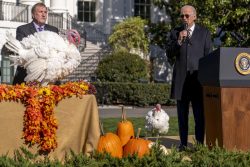 WASHINGTON (AP) – It’s holiday time at the White House. President Joe Biden and his wife, Jill, were plunging into the holiday season. Biden participated in the annual pardoning of a Thanksgiving turkey on Monday. The first lady was set to accept delivery of the official White House Christmas tree. And both Bidens were heading to North Carolina later Monday to share a Thanksgiving-style meal with members of the military and their families at Marine Corps Air Station, Cherry Point. The burst of holiday activity follows the president’s granddaughter’s White House wedding and his 80th birthday over the weekend. (Photo: AP)