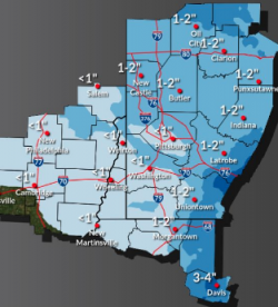 WASHINGTON, Pa. — Multiple accidents were reported overnight into Sunday morning due to snow showers and slightly covered roads in Washington County this weekend. The biggest accident occurred around midnight on Interstate 70 westbound near the Eighty-Four/Glyde exit according to reports. Officials say a rollover crash had both lanes of traffic closed at the 25-mile marker for over an hour as crews responded to the scene. There was no word on any injuries or identities of those involved. Another incident reportedly involved a tractor-trailer at the North Junction that blocked the ramp from Interstate 70 eastbound to I-79 north Sunday morning. (Photo: National Weather Service Facebook Page)