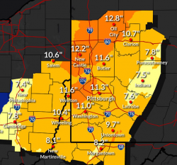 Winter Storm Izzy is expected to dump accumulating snow on the area Sunday night and Monday, prompting a winter storm warning from Sunday afternoon at one through Monday afternoon. A storm system entering the Pacific Northwest will dive southeast and end up along the gulf coast over the weekend. The storm will quickly drive northeast into the mid-Atlantic and Appalachians, bringing snow into the region Sunday afternoon and Sunday night. Southwestern Pennsylvania could see 8 to 12 inches of snow according to the National Weather Service. In the meantime, local municipalities are preparing for the onslaught. In the city of Washington, the head of the street department, Joe Pintola says their crews, which had been dealing with a COVID outbreak, are back to full force. He says crews have been pre-treating the streets with brine and if and when the snow falls, they’ll be ready to go. In Canonsburg, Mayor Dave Rhome says their crews are also ready and he is encouraging all residents to move their cars off the streets so road crews will be able to more easily remove the snow. Rhome is also asking residents who may have a fire hydrant in front of or near their homes, to shovel the snow around it so it can be easily accessible should firefighters need to use it. Meanwhile in neighboring Peters Township, officials have declared a Snow Emergency, meaning no cars are allowed to be parked on township streets and residents are asked to avoid travel if possible during the weather event. (Graphic courtesy of NWS Pittsburgh Facebook Page)