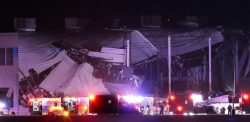 MAYFIELD, Ky. (AP) — Rescuers combed through fields of wreckage after a tornado outbreak roared across the middle of the U.S., leaving dozens dead and communities in despair. A twister carved a track that could rival the longest on record as the stormfront smashed apart a candle factory, crushed a nursing home and flattened an Amazon distribution center. “I pray that there will be another rescue. I pray that there will be another one or two,” Kentucky Gov. Andy Beshear said, as crews sifted through the wreckage of the candle factory in Mayfield, where 110 people were working overnight Friday when the storm hit. Forty of them were rescued. In Kentucky alone, 22 were confirmed dead by late Saturday, including 11 in and around Bowling Green. But Beshear said upwards of 70 may have been killed when a twister touched down for more than 200 miles (320 kilometers) in his state and that the number of deaths could eventually exceed 100 across 10 or more counties. The death toll of 36 across five states includes six people in Illinois, where an Amazon facility was hit; four in Tennessee; two in Arkansas, where a nursing home was destroyed; and two in Missouri. (Photo: AP)