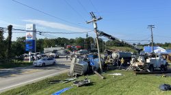 A medical helicopter was called to the scene of a tanker truck crash in Mt. Pleasant Township Monday morning. Washington County 9-1-1 dispatchers say the truck ended up on its side against a utility pole at the intersection of Avella Road and Henderson Road near the BP station. The helicopter arrived on scene but had to wait for crews to shut off power in the area to allow emergency crews to remove the driver from the vehicle. There is no word on his identity or condition. He was flown to UPMC-Presbyterian Hospital in Pittsburgh. Meanwhile, the driver of another tanker truck was injured in a separate crash earlier in the morning in West Bethlehem Township. A 9-1-1 dispatcher says this crash occurred just before 5:30 a.m. along Lone Pine Road. The unidentified driver was transported to a local hospital. There were no details on his condition. The roadway was closed for some time between Dunkard Church Road and Wherry School Road. HazMat crews were called to the scene of both accidents. (Photo: WPXI)