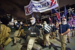 PHILADELPHIA (AP) – Police say scores of members of a group described by the Anti-Defamation League as white supremacist marched in Philadelphia over the weekend, clashing with pedestrians and setting off what were believed to be smoke bombs at one point. The group of Patriot Front members, estimated at 150 to 200 people, marched for several blocks in Center City carrying shields and flags and chanting slogans such as “Reclaim America” and “The election was stolen.” Police said pedestrians “engaged members of the group verbally” and there were several physical encounters. Police didn’t announce any arrests and said there were no reports of any damage or injuries.