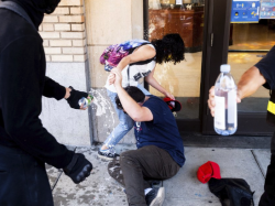 SAN FRANCISCO (AP) — A free speech demonstration staged by conservative activists quickly fell apart in downtown San Francisco on Saturday after several hundred counterprotesters surged the area, outnumbering and attacking those gathered, including knocking one in the mouth. A photographer working for The Associated Press witnessed a Trump supporter being taken away in an ambulance and an injured San Francisco police officer on the ground by San Francisco’s United Nations Plaza. Team Save America organized the rally to protest Twitter, which it said squelches conservative speech. Members of the group wore red “Make America Great Again” Trump campaign hats and carried pro-police “Thin Blue Line” flags and U.S. flags. Philip Anderson, the organizer of the event, posted photos to social media of his bloody mouth with a front tooth missing and another hanging loosely. He said anti-fascist protesters attacked him “for no reason.” Anderson took the stage at about 1 p.m. and was greeted by chants and plastic water bottles and glass bottles thrown over police barricades. The event was canceled, although both sides lingered in the area into the afternoon.
