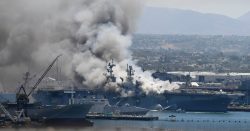 SAN DIEGO (AP) – A fire on the USS Bonhomme Richard at a San Diego naval base has been extinguished after a four-day battle against one of the worst infernos to rip through a U.S. warship outside of combat in recent years. Now the attention is turning to the fate of the 840-foot (255-meter) amphibious assault ship that has a collapsed forward mast. Once it’s safe, officials plan to go compartment by compartment to examine its charred bowels and determine if it is salvageable. Teams were checking the vessel to make sure no fire remained. An official investigation will begin into the cause of the blaze that started Sunday.