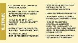Under the yellow designation, stay-at-home orders will be lifted and gatherings of up to 25 people will be allowed. Currently, the statewide red designation bans all gatherings or outside trips that are not related to health, safety or going to work at an essential job. Here is what is allowed in the “Yellow Phase:”