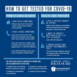 Worried that you have contracted the Coronavirus? Stay calm and follow these steps as announced by the Pennsylvania Department of Health. If you have mild symptoms, stay at home and contact your health care provider. If you have severe symptoms (fever over 100 degrees, shortness of breath, and cough) call your health care provider. If you do not have a health care provider, call your local health department or 1-877-PA-HEALTH. If you still need help, call your local emergency department.