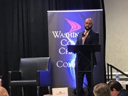 Every year the Washington County Chamber of Commerce presents its State of the Economy panel discussion. Leaders in economic development and forecast gather to look back on the previous year and try and take a peek into what may lie ahead. This year Mekael Teshome, Vice President of the Pittsburgh office of the Federal Reserve Bank of Cleveland (pictured) offered his thoughts on what the nation and the seven county metropolitan Pittsburgh region may expect. Energy is important to Washington County and he says his outlook is not one of a boom because low prices for gas will probably keep energy development weak. Teshome addressed weaknesses in unemployment in the region particularly in manufacturing and transportation but pointed to positive areas of employment growth particularly in professional services and in the automation/robotics industry. He said that those trends reflected nationwide trends. Stefani Pasham, CEO of the Allegheny Conference on Community Development addressed business owner’s issues with brain drain and described her efforts to keep college graduates from leaving the Pittsburgh region. Washington County Commissioners pointed to over $500,000,000 dollars of business development and the creation of nearly one-thousand jobs as pointing the county in the right direction for future years.