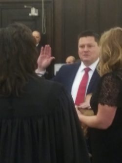 Swearing-in ceremonies were held Friday morning at the Washington County Courthouse for Washington County office holders and judges. Among those taking the oath of office, Republican incumbent County Commissioner Diana Irey Vaughn, who will now replace Democrat Larry Maggi as chairman of the board. Also being sworn in today, the newest County Commissioner, Nick Sherman (pictured) who will replace Democrat Harlan Shober who lost to Sherman in the November General Election. Both Irey-Vaughn and Sherman say one of their first orders of business will be to hire a new Human Services Director. Also being sworn in Friday morning were Republican Brenda Davis who will replace Democrat Frank Scandale as Clerk of Courts; Republican Laura Hough who replaces Democrat Joy Schury Ranko as Prothonotary: Republican James Roman as Register of Wills who replaces retiring Democrat Mary Jo Poknis and Republican Tom Flickinger who will replace retiring County Treasurer, Democrat Francis King. Traci McDonald Kemp was also sworn in Friday as the county’s new Common Pleas Court Judge.