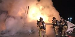 NEW STANTON, Pa. — A crash involving two tractor-trailers, one of which caught fire, had all westbound lanes of the Pennsylvania Turnpike blocked for several hours Tuesday morning in New Stanton. The crash was reported shortly before 5 a.m. Fire officials said the tractor-trailer that caught fire was carrying car batteries and there was an explosion when the crash happened. Crews were able to clear the crash and reopen westbound lanes by 8 a.m. to allow drivers who were stuck in traffic through. However, the detour at the Somerset exit remained in effect until shortly before 9 a.m.