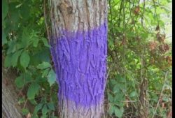 HARRISBURG, Pa. (AP) – Pennsylvania will allow landowners to legally notify hunters and others that they’re trespassing by painting purple stripes on trees or posts. The bill signed Wednesday by Gov. Tom Wolf is designed to ease a landowners’ task of posting “no trespassing” signs that deteriorate over time. The law takes effect in 60 days. The purple stripes must be vertical lines at least 8 inches long and 1 inch wide. They must be 3 to 5 feet off the ground, readily visible to a person approaching the property and no more than 100 feet apart. The law applies everywhere, except in Philadelphia and Allegheny County. Numerous other states have adopted a purple-paint law, and paint manufacturers have formulated cans of spray paint and brush paint specifically marketed as “no hunting” paint.
