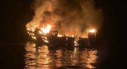 SANTA BARBARA, Calif. (AP) – Authorities are searching for the nine people who remain missing after a boat fire off the coast of southern California killed dozens who were left sleeping below decks with only one narrow stairway out. Coast Guard Lt. Cmdr. Matthew Kroll said Monday that 25 people had died, and the search would continue through the night for nine still unaccounted for. Authorities opened a family assistance center where counseling was being provided to relatives of those onboard the dive-boat Conception when it sank Monday. None of their names were immediately released. The missing and dead were among 39 passengers and crew who had departed Santa Barbara’s Channel Islands Harbor on Saturday aboard the boat Conception for a Labor Day weekend scuba-diving trip.