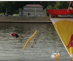 PITTSBURGH (AP) – A Pittsburgh TV reporter has sued over injuries he says he suffered during a promotional stunt in which he plunged 22 feet into the Allegheny River in a homemade flying machine. The lawsuit by KDKA reporter Dave Crawley names EQT Three Rivers Regatta, Red Bull and a marketing agency. It stems from an August 2017 media piece before the Red Bull Flugtag event, in which teams in homemade devices “fly” from a pier into a river. The suit contends Crawley was left with spleen and diaphragm injuries and a traumatic brain injury. The regatta declined to comment, saying officials were still “gathering information and reviewing the details” of the lawsuit. Red Bull says “the safety of spectators and participants is always our primary concern.” (Photo; KDKA YouTube)