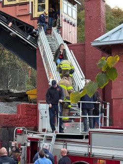 PITTSBURGH — 27 passengers were rescued from the Monongahela Incline Saturday after the cars stopped with people inside. A Pittsburgh Regional Transit spokesperson says the incline stopped working unexpectedly between 30 and 40 feet from the stations around 2:25 p.m. Operations staff tried to restart the incline before a manual rescue effort began. Twenty-two passengers were on the east car, which stopped close to the lower station, the spokesperson says. Five passengers were on the west car, which stopped close to the upper station. Pittsburgh paramedics had rescued all five passengers from the west car using a rope system by 4:30 p.m., the Pittsburgh Public Safety Department says. Four passengers from the east car had been individually rescued by 5:44 p.m. To hasten the process, crews began bringing passengers down using a fire ladder truck until all passengers had been rescued by 6 p.m. PRT will operate shuttle buses from the bus stop behind Station Square to the Mon Incline Upper Station until the incline reopens. Buses will run every 15-20 minutes.