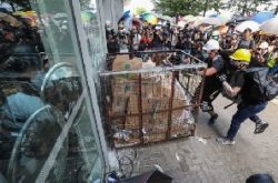HONG KONG (AP) – Police in Hong Kong have used tear gas to clear a crowd of protesters gathered outside the city’s legislature after several hundred broke into the building and spray-painted pro-democracy slogans on the walls of the main chamber. In a slow and deliberate operation, large numbers of officers began moving in after taking positions outside the legislature around midnight. Protesters had swarmed into the building about 9 p.m. Monday after breaking windows and prying open metal security curtains. Some who had gathered outside quickly scattered as police lobbed tear gas canisters and advanced behind tall clear shields. Inside the legislature building, police wearing helmets entered the main chamber with shields but found only media inside.