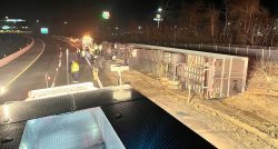 BENTLEYVILLE, Pa. — Multiple emergency crews responded to a tractor-trailer rollover crash in Somerset Township early Monday morning. Reports say a truck rolled in the eastbound lanes between the two Bentleyville exit ramps just around 12:45 a.m. The driver of the truck was reportedly trapped at first, but managed to get out of the vehicle before crews arrived. The driver was treated by EMS on scene. Bentleyville Fire-Rescue and the Ellsworth Fire Department worked to clear that incident along with PennDOT and a towing company. (Photo: Bentleyville Fire-Rescue Facebook Page)