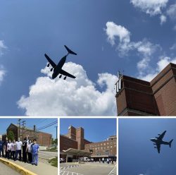 Shortly before noon on Memorial Day, the 911th Airlift Wing of the Pennsylvania National Guard flew over WHS Washington Hospital as a tribute to honor healthcare professionals and first responders who are on the front lines of the COVID-19 pandemic. The flyovers also took place at several hospitals in Allegheny County as well as Canonsburg General Hospital. (Photo courtesy of WHS/Facebook)