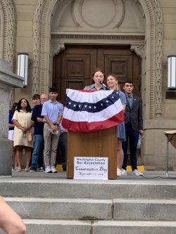 Students, lawyers and lovers of the constitution gathered on the Washington county courthouse steps Tuesday afternoon to mark the 237th anniversary of the signing of one of the country’s most important documents – The United States Constitution. Constitution Day recognizes the actual date the document was signed into law, September 17, 1787. The Washington County Bar association sponsors the annual event and association President Todd Pappasergi says members of the community and students gather for about 90 minutes every year to read the document in its entirety.