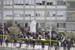 ROME (AP) — Pope Francis has appeared on a hospital balcony to bless the crowd in his first public outing in five weeks and ahead of his release after surviving a life-threatening bout of pneumonia. The 88-year-old pope gave a thumbs up and acknowledged the crowd after he was wheeled out onto the balcony overlooking the main entry of Rome’s Gemelli hospital, where hundreds of people had gathered on a brilliant Sunday morning. Chants of “Viva il papa!” and “Papa Francesco” erupted from the crowd.