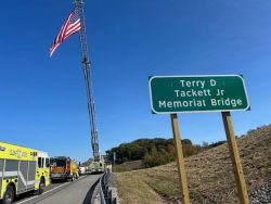 The bridge that carries Pennsylvania Turnpike 576 over Pennsylvania State Route 980 just outside of McDonald was dedicated to a Presto Volunteer Fireman. The Terry D. Tackett, Jr. Memorial Bridge was named because of the heroics that Tackett performed to save a woman’s life in Pittsburgh after her car ran into a building leaving her bleeding and unconscious. The bridge is located just feet away from the home where he grew up. Tackett’s father, Terry D. Tackett, Sr. was emotional and humbled as he spoke of his son’s heroics that day and how he misses his son since he was killed in an automobile accident in 2022. Tackett, Sr. spoke of how he did battle with Matt Burd of the Turnpike Commission over flooding that occurred 17 times because of the bridge’s construction. He said he now considers Burd a friend and he looks at the bridge that he hated in a different light. Tackett said that Terry was not just a hero for the Presto Fire Department, Terry was his own personal hero. State Representative Jason Ortitay (R-46) was responsible for the legislative work necessary to have the bridge dedicated in Tackett’s honor.
