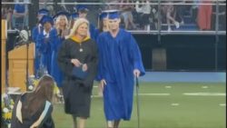 CANONSBURG, Pa. — (WPXI) – A senior at Canon-McMillan who was badly hurt in a house fire in February was able to walk the stage at graduation. Dominic Mansmann is being released from the West Penn Hospital burn unit Friday after a 102-day stay. Dominic overcame incredible obstacles and walked last Friday night at his high school graduation. In February, Dom was rushed to the hospital with burns covering 70% of his body, after a terrible house fire. The fire miraculously missed his face and feet. “He was on the ventilator for weeks, it was surgery after surgery,” said his mother, Joni Mansmann, who has been by his side since February. “Honestly, at the beginning of this, I didn’t think we’d have him, let alone have him walk at graduation. I’m very, very proud of him.” The Canon Mac hockey player couldn’t walk or stand, but through excruciating pain, he gave himself a goal. “I’m going to get out of the bed every day and walk these halls so I can walk on the turf and show these people thank you,” he said. Dominic’s entire care team showed up for his graduation, including his doctor who shot a video of him walking.
