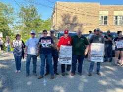 Donegal Township Supervisors were greeted at their business meeting with approximately 3 dozen supporters of the township road crew that is represented by the International Union of Operating Engineers Local 66. Supporters lined the street with signs and chants of support prior to the meeting. William Riggle is a member of the road crew that saw its numbers dwindle from a high of six workers to its present two through recent layoffs. He says that the township supervisors are picking on the road crew specifically and are trying to have the union removed. Riggle says they don’t care for the people and gave the example of him being hurt and his colleague having to work alone as Riggle himself recovers from an injury. Recently a third person was brought on until Riggle fully recovers. During the meeting, Supervisors had their labor negotiator Phil Binotto make a presentation to residents. He called the situation an impasse and is urging both the union and supervisors to sit down and come to common ground. The road crew has been working on an expired five year contract since 2023. Binotto described the contract as very union friendly and rich. According to Supervisor Chairman Jim Bauer, the township is looking to regain control of finances and management of the employees. Some of the items that are at issue are health care benefits, currently the union has all of their health care paid in full. The township is looking for premium payment and deductible concessions. Currently overtime is paid in comp time. The township wishes to return to paid overtime. The township also wishes to use subcontractors when that would be a cheaper option than using in house labor. Several other issues remain unsolved. Both Binotto and IUOE 66 representative Larry Cardillo agree that both sides need to return to the bargaining table.