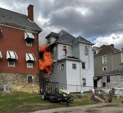 WASHINGTON, Pa. — Fire destroyed a home in the City of Washington Tuesday afternoon. The house on East Maiden Street is broken into two apartments and two families are now displaced. According to our news partners at Channel-11, Neighbor Elijah Emerick first spotted the flames on his home security camera. He just happened to check the camera while he was at work. Before rushing home, he called 911 and alerted his fiancée, Dakota Martin. The heat of the flames even busted out a window of a house next door. Thankfully, public safety officials said no one was home when the fire started and no one was hurt. The Red Cross is helping both displaced families. (PHOTO; Facebook)