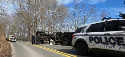 Details are sketchy, but police in North Strabane Township asked motorists to avoid the 200 block of Linden Creek Road Thursday morning. The road was closed due to a commercial vehicle crash involving a dump truck that landed on its side, spilling its load of dirt. There is no word on how the accident happened or whether there were any injuries. (Photo: North Strabane Township Police Facebook Page)