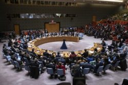 UNITED NATIONS (AP) — The U.N. Security Council has adopted a watered-down resolution calling for immediate speeded-up aid deliveries to hungry and desperate civilians in Gaza – but without the original call for an “urgent suspension of hostilities” between Israel and Hamas. Friday’s long-delayed vote in the 15-member council was 13-0 with the United States and Russia abstaining. The vote came immediately after the United States vetoed a Russian amendment that would have restored a call to immediately suspend hostilities. The U.S. abstention on the resolution avoided a second U.S. veto of a Gaza resolution following Hamas’ surprise Oct. 7 attacks inside Israel. A relieved U.S. Ambassador Linda Thomas-Greenfield told the council after the resolution’s adoption: “This was tough, but we got there.”