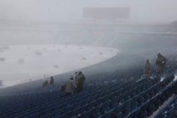 BUFFALO, N.Y. (AP) — With snow falling at a rate of 2 inches per hour, a group of about 85 people tried to dig out the Buffalo Bills’ stadium in Orchard Park, New York, on Sunday. The Bills’ playoff game against the Pittsburgh Steelers was postponed to Monday because of a lake-effect storm that was expected to drop 1 to 3 feet of snow in the area. The Bills paid snow shovelers $20 an hour, but one person who participated, Logan Eschrich, says the work at Highmark Stadium was nearly impossible. The storm was expected to taper off Sunday night, allowing time to clear roads and prepare the stadium for the game.