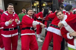 NEW YORK (AP) — Thousands of people dressed as jolly Old St. Nick have descended on New York City for the annual SantaCon charity pub crawl. The booze-fueled stroll through Manhattan kicked off Saturday morning in bars in midtown. Revelers were expected to make their way downtown where the festivities end in local watering holes in the Village. The organizers encouraged participants to donate $15 to enter participating venues, which they have said will go to charitable causes. Similar Christmas-themed bacchanals were slated in cities across the U.S. and Europe, from San Francisco and Cincinnati to London and Berlin, on Saturday. (Photo: AP)