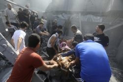 BUREIJ REFUGEE CAMP, Gaza Strip (AP) — Airstrikes in the Gaza Strip’s Bureij refugee camp have flattened entire apartment buildings, sending scores of injured Palestinians into a hospital unable to grant them bed space. In Al-Aqsa Hospital in the central Gaza Strip, young children covered in ash bled out on hospital floors as relatives and medics crowded around. Israel says its airstrikes are aimed at Hamas militants and accuses the group of using crowded residential areas for cover. But the strikes often cause heavy civilian casualties, stretching a medical system that has been strained by shortages of fuel and medical supplies.