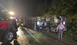 HARRISBURG, Pa. (AP) — Authorities say three passengers died after a bus carrying up to 50 people struck a vehicle on an interstate in Pennsylvania. State police say the crash happened during heavy rain around 11:50 p.m. Sunday on southbound Interstate 81 in Dauphin County’s Lower Paxton Township, outside Harrisburg. Police say the bus flipped on its side. Multiple people also were taken to a hospital with injuries, but police didn’t immediately release further information. A bus passenger said it was covering a normal route between New York and Ohio, adding the crash threw people from their seats and left some piled on top of others. The cause of the crash remains under investigation. (Photo: WPXI)