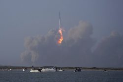 SOUTH PADRE ISLAND, Texas (AP) — SpaceX’s giant new rocket exploded minutes after blasting off on its first test flight and crashed into the Gulf of Mexico. Elon Musk’s company was aiming Thursday to send Starship on a round-the-world trip from the southern tip of Texas, near the Mexican border. SpaceX said multiple engines were not firing as the rocket ascended, causing it to lose altitude. The rocket was intentionally destroyed by its self-destruct system, exploding and plummeting into the water. SpaceX plans to use Starship to send people and cargo to the moon and, ultimately, Mars. Throngs of spectators watched from several miles away from the Boca Chica Beach launch site, which was off-limits.