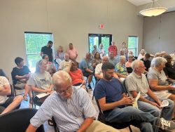 North Franklin Township Supervisors were greeted by a crowd of approximately 50 residents for their meeting on Tuesday. Scheduled speakers included Ridgewood Road resident George Leasure who spoke for the whole street. He employed a power point presentation to describe back yard flooding that occurred on June 14 and July 26. Some of that flooding affected people’s basements. He showed how a cross drain needs maintenance to clear out silt that holds water and limits the flow of the pipe during heavy rains. He also called into question the maintenance of a pond in Walnut Ridge. His presentation prompted more than a dozen other complaints from residents in other areas of the township, particularly from Cario Drive and Holiday Hills residents. Supervisor Bob Sabot sympathized with residents as he described his own dealings with flood waters. He pledged to work to get infrastructure failures addressed either temporarily or as in the case of Ridgewood Drive, totally next year during the road paving season. Sabot made an interesting comment about development. He said the board is concentrating on supporting the Washington Crown Center Mall redevelopment and addressing current infrastructure deficiencies before approving more housing to add to the existing problems with water and adding more cars to create traffic problems.