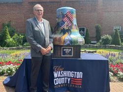 The United States is celebrating its 250th birthday in 2026 and the America 250 PA organization helped Washington County celebrate their part in the history of the United States. America 250 Pa held a Bells Across PA celebration in the LeMoyne House Garden to unveil Washington County’s commemorative bell that celebrates America’s history from the Revolutionary War to today. All 67 counties in Pennsylvania will have a commemorative bell. James Sulkowski (pictured) is a world-renowned artist from Canonsburg and he was chosen to design Washington County’s version of the Liberty Bell replica. His design is centered on George Washington flanked by the original American Flag. He steps through Pennsylvania’s early history with depictions of the Whiskey Rebellion, glass manufacturing, and agriculture. He included river commerce with the Monongahela River, and modern history such as the Meadows Race Track and the Pony League World Series. In his remarks to the approximately 100 people on hand, Clay Kilgore, Executive Director of the Washington County Historical Society, reminded the audience that the final western battle in the Revolutionary War was fought in Washington County. He emphasized the Whiskey Rebellion and the importance Washington County played in the Underground Railroad with the LeMoyne House. He called Washington County the ‘Gateway to the West” in the 18th and early 19th centuries. The bell was donated to the Washington County Historical Society by the Washington County Chamber of Commerce and the Washington County Tourism Promotion Agency for permanent display.