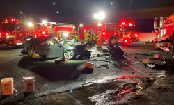 WALNUT CREEK, Calif. (AP) — Fire officials in Northern California say a Tesla driver was killed and a passenger was critically injured when the car plowed into a firetruck that was parked on a freeway. The Contra Costa County Fire Protection District says four firefighters suffered minor injuries when the truck was hit early Saturday morning. The ladder truck had been blocking lanes on Interstate 680 to help clear an earlier accident that did not involve injuries. Assistant Chief Tracie Dutter says the Tesla driver was declared dead at the scene. The passenger was hospitalized. Photos showed the front end of the car was crushed and the $1.4 million ladder truck was damaged.
