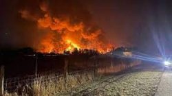 EAST PALESTINE, Ohio (AP) – A train derailment and resulting large fire have prompted an evacuation order in an Ohio village near the Pennsylvania state line. The Friday night derailment covered the area in billows of smoke lit orange by the flames below. Rail operator Norfolk Southern says about 50 cars derailed in East Palestine as a train was carrying a variety of freight from Illinois to Pennsylvania. No injuries were reported. An evacuation order remained in place early Saturday for people within a mile of the scene, and other residents were urged to stay inside. There was no immediate word on what caused the derailment. (Photo Credit WPXI)
