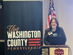 The Washington County Chamber of Commerce and Tourism Promotion Agency chose the Pennsylvania Trolley Museum as its host for their February Breakfast Briefing. Chamber President Jeff Kotula pointed out that tourism is an important industry in Washington County that accounts for $700,000,000 annually and employs 6000 people and a part of that tourism package is the Pennsylvania Trolley Museum which is celebrating its 70th anniversary on February 7th. Scott Becker, Executive Director of the museum, says he was honored to host the event. During his remarks he thanked Washington County for its support over the years from the museum’s initial purchase of three trolleys in 1954 to the current campus that houses interactive displays designed by the Carnegie Science Center and a display building that houses most of the 52 trolleys that the museum owns and Volunteer Blvd., a brick paved street commemorating days gone by. Carrie Lepore, Deputy Secretary of Tourism for the Pennsylvania Department of Community and Economic Development (pictured) cited destinations like the Pennsylvania Trolley Museum as important drivers in tourism. She said that not only does the venue prosper, but so do local businesses like restaurants, gas stations and hotels. She pointed to tourism locations as great sources of education especially with schools. The museum has several events coming up over the next few months beginning with a volunteer open house on Saturday February 10. They also are finalizing details of the Bunny Trolley event beginning on March 22. For more information check their website at www.patrolley.org.