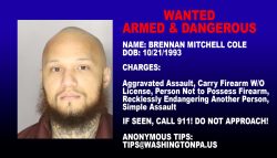 A man who police say is armed and dangerous is facing charges a month after a shooting at the Washington Community Club. On Wednesday, Washington Police announced that an arrest warrant has been issued for 32-year-old Brennan Cole who is facing aggravated assault, simple assault, recklessly endangering another person and two firearm charges. He’s accused in a Thanksgiving Day incident where a man was shot multiple times. Authorities say Cole was kicked out of the Washington Community Club in the early morning hours of Thanksgiving, but came back a few minutes later, saying he forgot his coat. The club’s security guard, Cory Whitlock, told police Cole got into an argument with the owner, Richard Barnes Jr., then punched Barnes in the face when he wouldn’t let him back inside. Court documents said Cole was wrestled to the ground on the sidewalk, and during that struggle, multiple shots were fired. Police say Whitlock, who was working as a bouncer and checking people in, was shot at least once in the foot and leg. He was taken to UPMC Washington and eventually transferred to UPMC Mercy for treatment. Authorities say Cole should be considered armed and dangerous. Anyone who knows where he may be should call the City of Washington Police Department immediately. If you see him, do not approach, but instead, call 911.