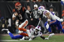 CINCINNATI (AP) — Joe Burrow threw for a season-high 348 yards and had two touchdown passes as the Cincinnati Bengals won their fourth straight, beating the Buffalo Bills 24-18 in a key AFC matchup. Burrow was 31 for 44, completing passes to eight different receivers, with tight ends Irv Smith Jr. and Drew Sample making the touchdown grabs. Tee Higgins had eight receptions for a season-high 110 yards. Cincinnati’s defense kept Josh Allen and the Bills playing from behind.