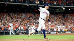 HOUSTON (AP) – It took 11 innings, but the Houston Astros were able to even the American League Championship Series at a game apiece. Carlos Correa delivered a walk-off, solo homer off J.A. Happ in the 11th inning to give the Astros a 3-2 triumph over the New York Yankees. It was just Houston’s second hit since George Springer tied the game with a solo blast in the fifth inning off Adam Ottavino. Correa also opened the scoring with an RBI double in the second inning off Yankees starter James Paxton, who lasted just 2 1/3 innings. The lead held up until Justin Verlander surrendered his first hit of the night, a two-run homer by Aaron Judge in the fourth. Verlander struck out seven and gave up five hits over 6 2/3 innings. Josh James struck out the only batter he faced in the 11th inning to get the win. Yankees slugger Giancarlo Stanton was held out of the starting lineup due to a quad injury. Game 3 is Tuesday at Yankee Stadium. Gerrit Cole is slated to pitch for Houston that night against Luis Severino.