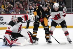 PITTSBURGH (AP) — Jesper Bratt, Alexander Holtz and Tyler Toffoli scored in the third period, and the short-handed New Jersey Devils beat the Pittsburgh Penguins 5-2. The Devils played without forwards Timo Meier, Nico Hischier and Jack Hughes, but they were still able to beat Pittsburgh for the sixth straight time overall. Vitek Vanecek made 23 saves for New Jersey, which had dropped three in a row and four of five overall. Bratt gave the Devils a 3-2 lead 2:35 into the third, beating Tristan Jarry over the shoulder to the blocker side during a 4-on-4 stretch.