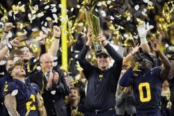 HOUSTON (AP) — Jim Harbaugh and No. 1 Michigan completed a three-year climb to a national championship by beating No. 2 Washington 34-13 Monday night in the College Football Playoff title game. Blake Corum ran for 134 yards and two fourth-quarter touchdowns for the Wolverines. Michigan was undeterred by suspensions and a sign-stealing case that shadowed the program much of the season. The Wolverines sealed their first national title since 1997 when Corum blasted in from the 1-yard line with 3:37 left. Harbaugh delivered the title so many expected when he took over a struggling powerhouse in 2015.