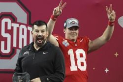 ARLINGTON, Texas (AP) — Quinshon Judkins ran for two touchdowns before Jack Sawyer forced a fumble by his former roommate and Texas quarterback Quinn Ewers that he returned 83 yards for a touchdown with 2:13 left as Ohio State beat Texas 28-14 in the Cotton Bowl. The 13-2 Buckeyes advance for a shot at their sixth national title. Their semifinal victory came in the same stadium where they were champions in the debut of the College Football Playoff as a four-team format. Now they have the opportunity to be the winner again in the debut of the expanded 12-team field when they play Notre Dame on January 20.