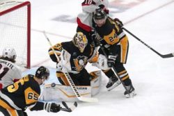 PITTSBURGH (AP) — Shane Pinto scored two special teams goals in the first period, Leevi Merilainen stopped 30 shots and the Ottawa Senators beat the Pittsburgh Penguins 5-0. Pinto beat Alex Nedeljokvic on the power play just over five minutes into the game then added a short-handed goal in the waning moments of the opening frame as the Senators won for just the second time in their last eight games. Tyler Kleven, Drake Batherson and Tim Stutzle also scored for the Senators. Claude Giroux added three assists as Ottawa won its sixth straight over Pittsburgh.