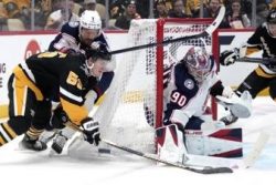 PITTSBURGH (AP) — Kirill Marchenko and Kent Johnson scored in the shootout and the Columbus Blue Jackets rallied to beat the Pittsburgh Penguins 4-3 on Tuesday night. Elvis Merzlikins, who made 20 saves, stopped Bryan Rust and Sidney Crosby in the shootout, as Columbus came back from a 3-1 deficit in the third period. Adam Fantilli scored a third-period power-play goal and Dmitri Voronkov scored twice, giving him nine goals in seven games. Rickard Rakell scored twice and Michael Bunting set a career high with his eighth power-play goal. Crosby had two assists. Tristan Jarry made 26 saves.